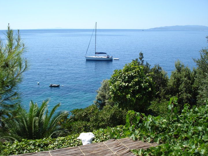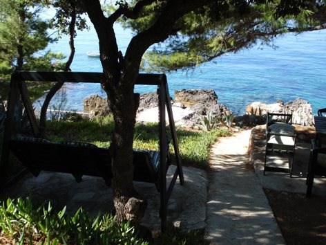 - Prostory v zahradě nabízí příjemné posezení ve stínu borovic a palem s krásnými dřevěnými stoly a výhledem na moře